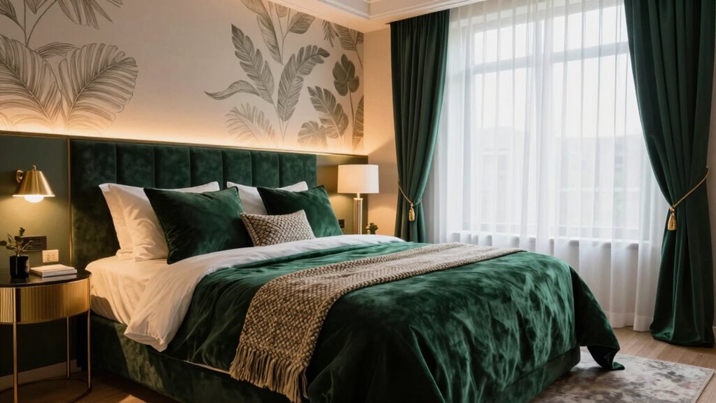 After selecting your stylish decor and thoughtful lighting, the next step is to prioritize comfort through cozy bedding and soft textures. Start with high-quality sheets and a plush duvet to create a welcoming, luxurious feel. Layer your bed with plush pillows in various sizes and textures to add depth and softness. Incorporate luxurious throws at the foot of the bed for extra warmth and tactile appeal. Opt for fabrics like velvet, chenille, or faux fur to enhance the soft, inviting atmosphere. Utilizing landscaping can also help create a tranquil, nature-inspired backdrop that complements your cozy retreat. These elements not only elevate your bedroom’s comfort but also contribute to a boutique hotel vibe. Focus on tactile richness and simplicity to make your space both stylish and irresistibly cozy. Additionally, choosing ethically sourced textiles can help ensure your comfort choices align with sustainable and responsible consumer practices. Incorporating sustainable textiles can also add a layer of eco-conscious elegance to your cozy bedroom. Incorporating innovative fabric technologies can further enhance durability and softness, ensuring your bedding remains inviting over time.