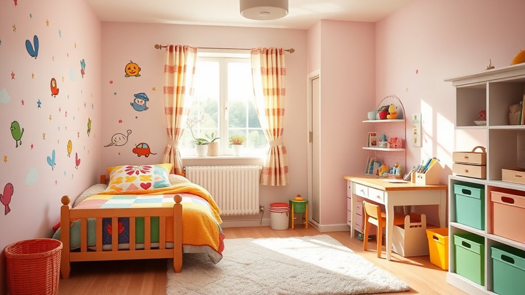 You should prioritize safety by installing outlet covers and securing furniture to walls, ensuring your child’s playroom organization is clutter-free to prevent falls. Use wall decal ideas that are non-toxic and easily removable to add fun without hazards. Keep small items out of reach and choose soft, rounded-edged furniture. Regularly check for wear and tear, making sure your child’s space remains safe and inviting for play and learning.