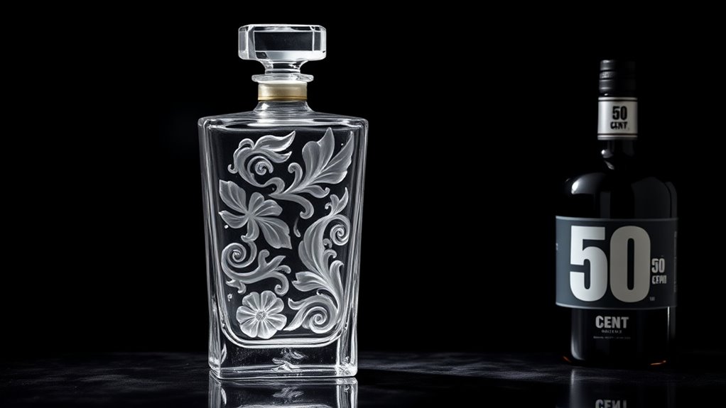 As you examine the decanter, you’ll notice the meticulous craftsmanship that Lalique is famous for. The glass is crystal-clear, with a smooth finish that feels luxurious to the touch. The shape isn’t just functional; it’s sculptural, with a silhouette that commands attention. Lalique’s artisans have poured their expertise into creating a piece that’s both elegant and distinctive. Meanwhile, 50 Cent’s influence shows through subtle design elements—perhaps a textured pattern inspired by urban aesthetics or a logo that adds a touch of street cred. These details aren’t just decorative; they tell a story of innovation and cultural fusion. You’ll appreciate how the collaboration elevates the traditional decanter into a work of art, one that’s meant to be displayed and admired.