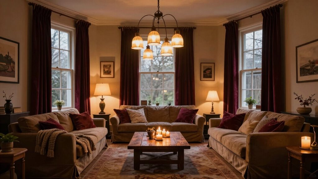 To make a large room feel more intimate, layering soft fabrics is essential because they introduce warmth and texture that invite comfort. You can layer textures by adding plush throws, cozy blankets, and soft cushions to your furniture. Incorporate warm colors in your fabrics to enhance the inviting atmosphere. Here are four ways to do it: