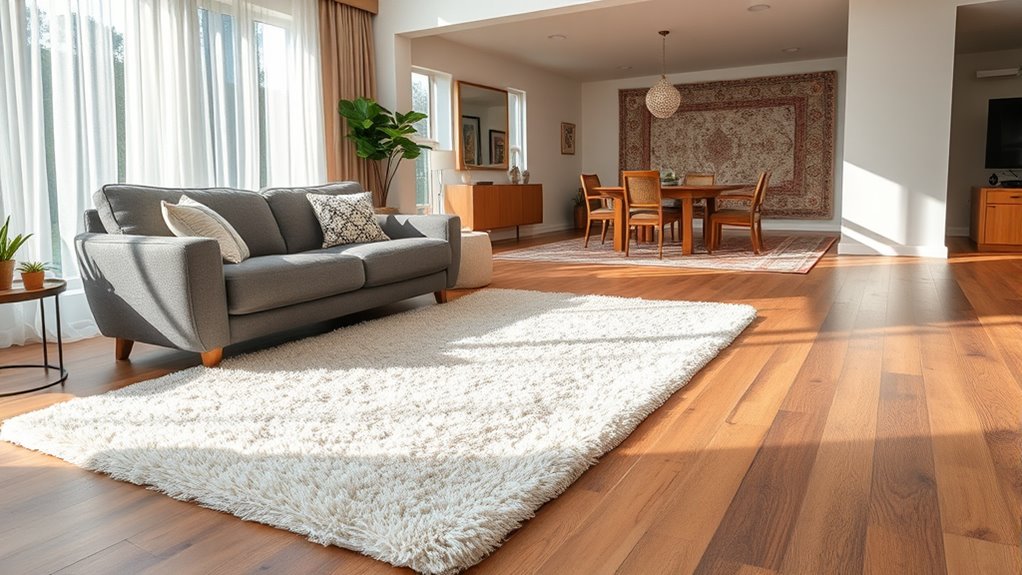 For high-traffic areas, opt for a large rug that extends under furniture, like in a living room, to protect your floors and withstand wear. Consider durability by choosing materials like wool or synthetic fibers, which resist stains and foot traffic. For example, a 8×10 wool rug in your entryway offers both durability and style. Prioritize thicker, tightly woven rugs to guarantee longevity and easy maintenance in busy spaces.