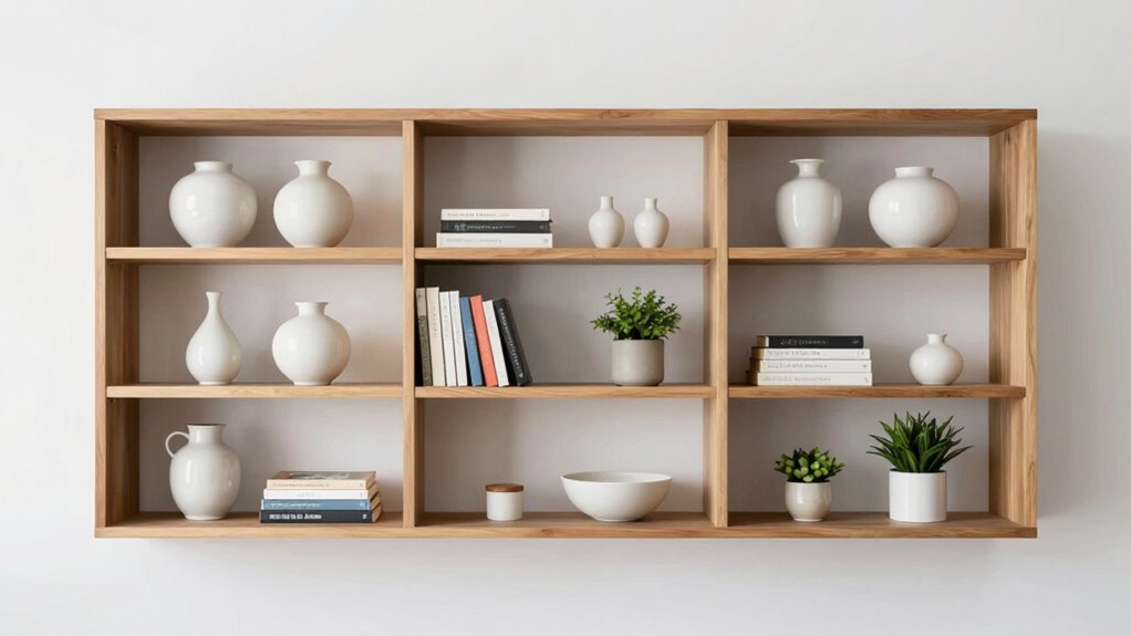 In small or awkward spaces, you can transform your shelves into eye-catching displays by carefully choosing decorative accessories that fit perfectly. Start by selecting items in a cohesive color palette, boosting visual harmony. Use vertical stacking or leaning art to maximize space and add interest. Don’t forget, strategic placement of smaller accessories can create the illusion of more room, making even tight spots feel thoughtfully styled and inviting.