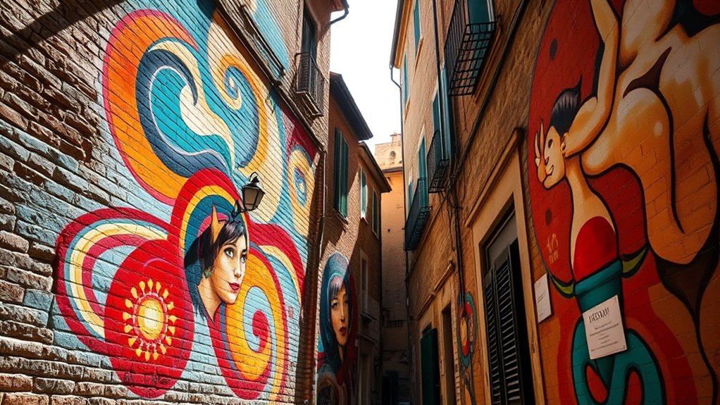 Diese Zunahme an Straßenkunst in Trastevere ist nicht nur eine Frage der Ästhetik; sie spiegelt den dynamischen, ständig sich verändernden Geist des Viertels wider. Die Akzeptanz der Graffiti-Kultur hat dazu beigetragen, Barrieren abzubauen, und öffentliche Räume in Freiluftgalerien verwandelt. Während Sie erkunden, werden Sie feststellen, wie diese Wandmalereien und Graffitikunstwerke als visuelle Erzählungen dienen, die die Geschichte, Kämpfe und Aspirationen der Gemeinschaft einfangen. Die mutigen Farben und innovativen Techniken inspirieren Innenarchitekten und Wandkünstler weltweit, die sich vom rohen, authentischen Energie der Straßenkunstszene Trasteveres inspirieren lassen. Viele dieser Innenraum-Murals spiegeln denselben revolutionären Geist wider und verbinden Street Art-Stile mit Innenarchitekturkonzepten, um Räume zu schaffen, die lebendig wirken und kulturelle Bedeutung ausstrahlen.