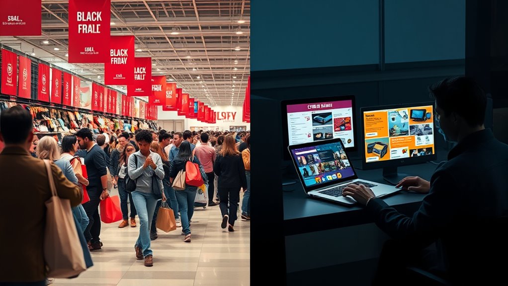 Black Friday happens right after Thanksgiving and focuses on in-store doorbuster deals, often with early morning lines and crowded stores. Cyber Monday takes place the following Monday and emphasizes online shopping from the comfort of your home, offering exclusive deals and quick browsing. Both days kick off the holiday shopping season, but if you prefer physical stores or online shopping, your experience will differ. Keep exploring to uncover more tips for maximizing your savings on these busy shopping days.