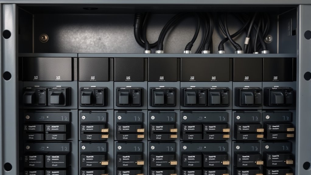 A circuit breaker panel is the central hub for your home’s electrical system, designed to protect your wiring and appliances from overloads and short circuits. It’s fundamental to understand how it works, especially when it comes to grounding safety and panel labeling. Proper grounding safety ensures that in the event of a fault, electrical current has a safe path to the ground, reducing the risk of shock or fire. Your panel should have a grounding bus bar connected to a grounding rod or metal underground water pipe. If this isn’t properly done, your entire electrical system could be unsafe, increasing the danger to you and your family. Always verify that your panel’s grounding system is intact and up to code. If you’re unsure, consulting a licensed electrician is your best move.