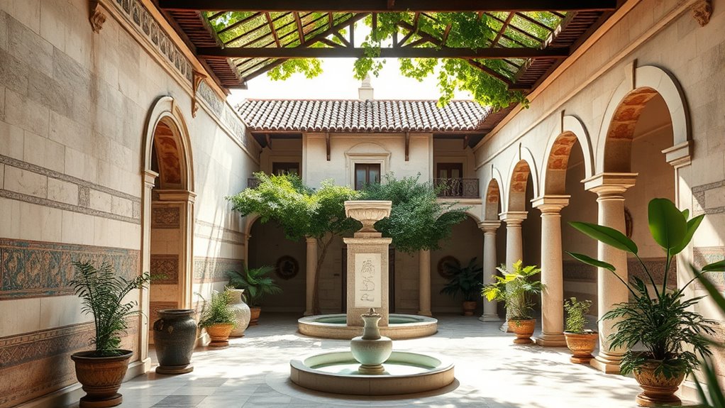 Alte römische Domus nutzten intelligente passive Kühltechniken, um die Häuser angenehm kühl zu halten. Sie bauten um zentralen Innenhöfe, die schattige, kühlere Mikroklimata schufen und die Luftzirkulation verbesserten. Dicke Mauern aus Vulkangestein oder Ziegel speicherten tagsüber Wärme und gaben sie nachts wieder ab, was die Temperaturen ausglich. Überhängende Dächer, schattige Säulengänge und Wasseranlagen wie Brunnen halfen, die Hitze zu reduzieren und die Verdunstung zu fördern. Wenn Sie weiter erforschen, entdecken Sie noch mehr Wege, wie diese zeitlosen Strategien moderne Kühllösungen inspirieren können.