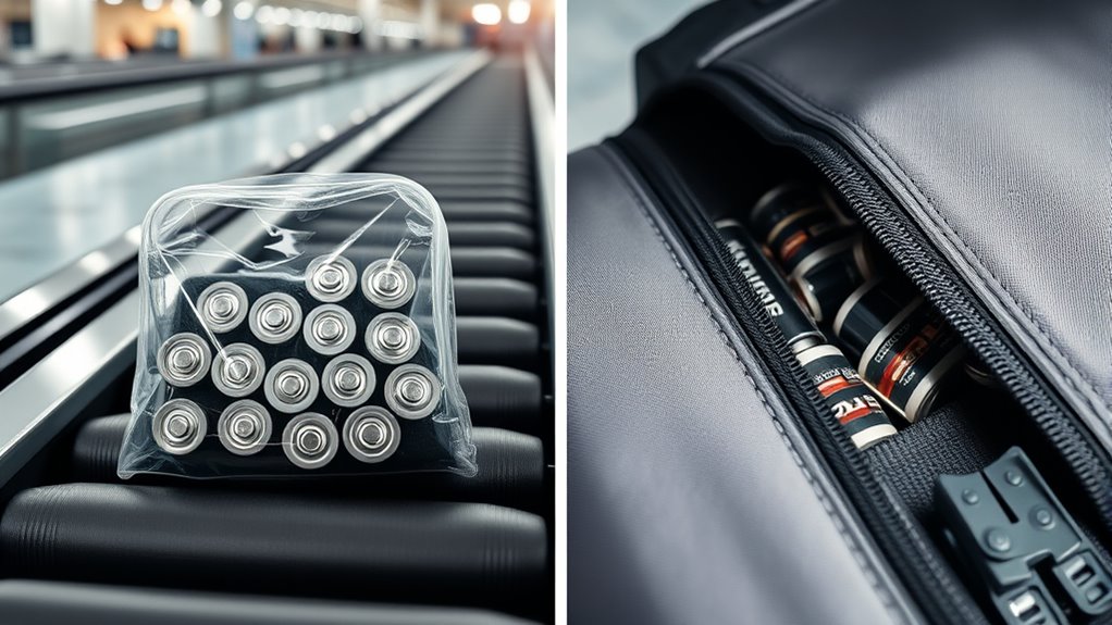You can’t pack spare batteries in checked bags—think of it as inviting a tiny, volatile fireworks show into the cargo hold. Airline policies emphasize battery safety, warning that spare lithium batteries pose fire risks if damaged. Instead, carry them in your carry-on, where you can keep a close eye. Ignoring these rules could turn your trip into a combustible adventure—and nobody wants to be that traveler.