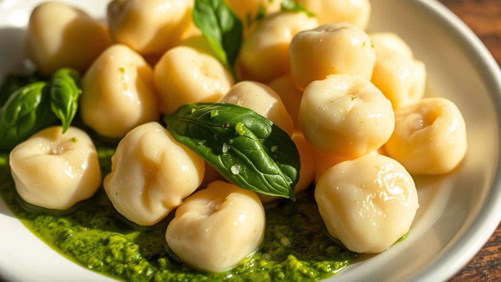 Um glutenfreie Gnocchi zu machen, die zuverlässig schwimmen, wählen Sie eine hochwertige glutenfreie Mehlmischung und kochen Sie Ihre Kartoffeln vollständig, bevor Sie sie pürieren, bis sie glatt sind. Lassen Sie die gestampften Kartoffeln leicht abkühlen, dann mischen Sie vorsichtig das Mehl, Salz und das verquirlte Ei unter, um einen weichen, zusammenhängenden Teig zu bilden. Formen Sie kleine Stücke daraus, dann kochen Sie sie in kochendem, gesalzenem Wasser, bis sie schwimmen, was zeigt, dass sie fertig sind. Achten Sie auf die Feuchtigkeit des Teigs und eine schonende Handhabung—diese Tipps helfen Ihnen, jedes Mal leichte, schwimmende Gnocchi zu meistern.