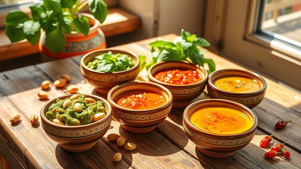 Um diese Saucen authentisch zu Hause zuzubereiten, konzentrieren Sie sich auf hausgemachte Techniken wie langsames Simmern und die Verwendung frischer Zutaten. Sie können Zutatenersetzungen vornehmen, um Ihren Vorratsschrank anzupassen, aber bleiben Sie nach Möglichkeit bei traditionellen Kräutern, Ölen und Proteinen. Verwenden Sie hochwertiges Olivenöl, frischen Knoblauch und reife Tomaten für einen intensiven Geschmack. Halten Sie es einfach und vermeiden Sie Abkürzungen, damit Ihre Saucen ihren regionalen Wurzeln treu bleiben.