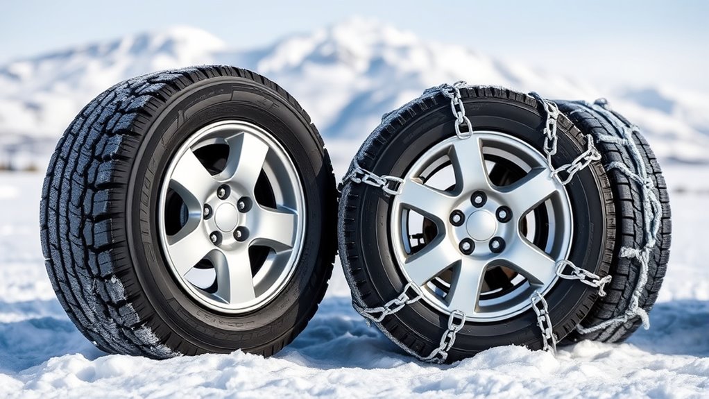If you’re renting a car for winter, snow tires are usually your best choice—they offer reliable grip, last multiple seasons, and require less hassle to install and manage. Chains can provide quick traction in extreme conditions but are more temporary, tougher to install, and may cause damage if misused. To find out which option fits your trip best and how to use them safely, keep exploring further.
