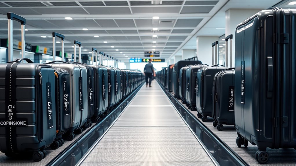 Luggage sizes in linear inches combine your bag’s length, width, and height to give a simple measurement for airline policies. Most airlines set limits by adding these dimensions together, often around 45 inches for carry-ons. Using linear inches makes it easier to verify your luggage complies and avoid extra fees or issues at check-in. Knowing how to measure your bags this way can save you time and hassle—keep exploring to learn more about traveling smart.