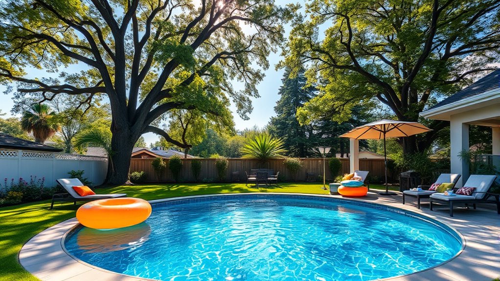 Maintaining an above ground pool is like tending a garden; it needs regular care to stay vibrant. I regularly skim debris, check chemical levels, and clean the filter. I also monitor water pH and sanitize weekly. Covering the pool when not in use helps keep dirt out, and a consistent maintenance schedule guarantees the water stays clean and safe. Staying on top of these tasks keeps the pool inviting all summer long.