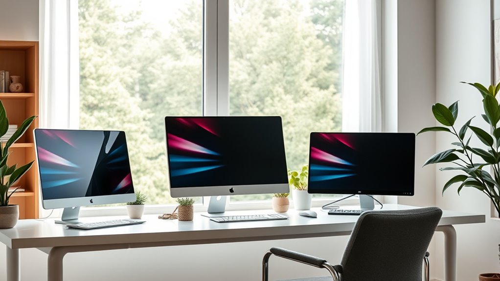 Choosing the right display quality and size is crucial for enhancing productivity in your home office. I’ve found that a high-resolution display, like 1920×1080 pixels, provides crisp visuals and clear text, making tasks like writing and browsing a breeze. Opting for an IPS panel is key, too; it offers wider viewing angles and accurate colors, which are essential for graphic design or media editing. I recommend screens of 23.8 inches or larger to improve multitasking and reduce eye strain during long sessions. Additionally, anti-glare coatings are a must-have, as they minimize reflections in bright environments. Finally, aim for brightness levels of at least 250 nits for vibrant images and clarity in various lighting conditions.