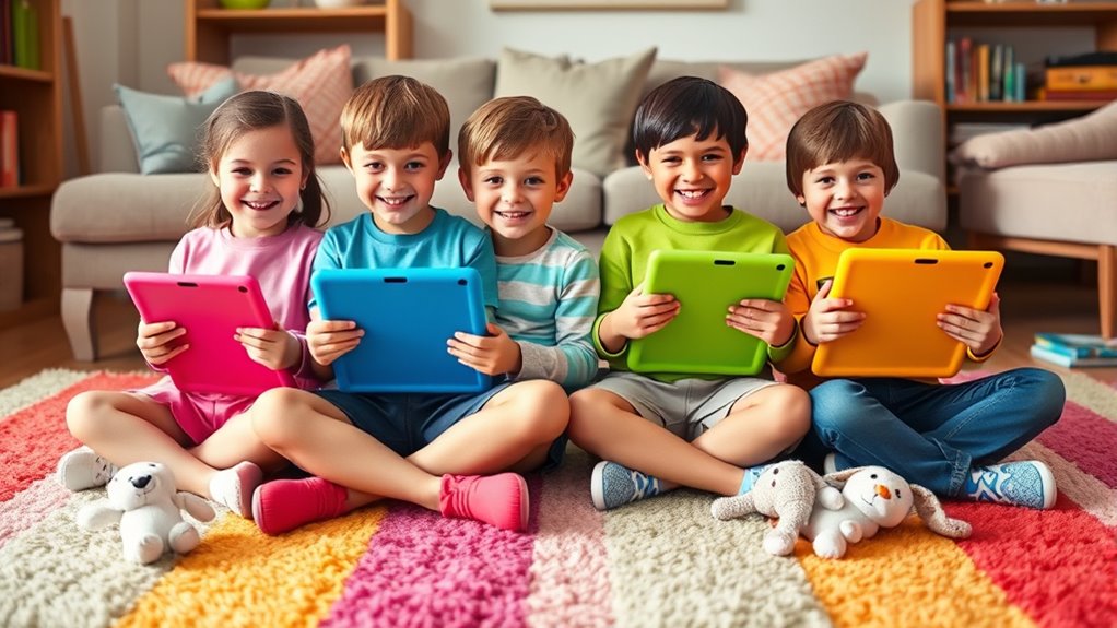 Have you ever wondered how to pick a tablet that’s just right for your child’s age and developmental stage? When choosing an Amazon Fire Kids Tablet, age-appropriate features are key. For younger children (ages 3-7), look for simplified interfaces, durable cases, and limited internal storage to prevent overwhelm. Parental controls should be easy to set, guaranteeing safe content and screen time limits. For older kids (ages 6-12), opt for devices with expandable storage, access to more apps, and communication features like video calling. Curated educational content and age-specific subscriptions keep the tablet engaging and relevant. These tailored features help ensure your child’s device supports their growth while providing a safe, fun, and educational experience.