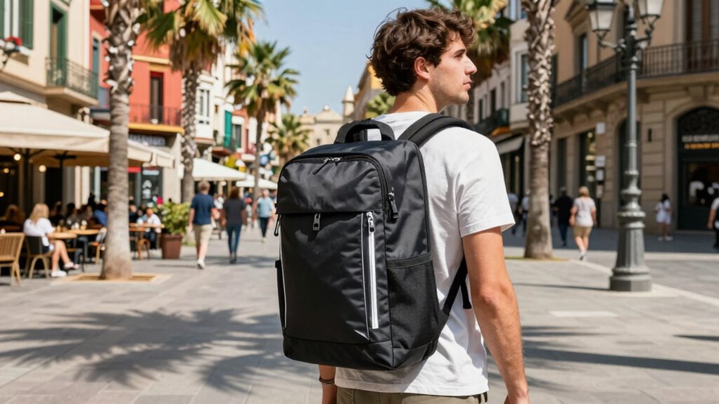 Choosing an anti-theft backpack for Barcelona means prioritizing security features that can genuinely protect your valuables. Features like RFID-blocking pockets are essential to guard against electronic pickpocketing and identity theft. Lockable zippers and slash-resistant fabrics act as physical barriers, deterring unauthorized access and physical theft. Hidden compartments and secret pockets make it harder for pickpockets to access your valuables without notice. Security elements such as locking straps and reinforced materials add extra layers of protection, preventing bag snatching or tampering. Multiple security layers, combining RFID protection with physical defenses, profoundly reduce the risk of theft during your travels. These features work together to give you peace of mind, so you can focus on exploring Barcelona without constantly worrying about your belongings.