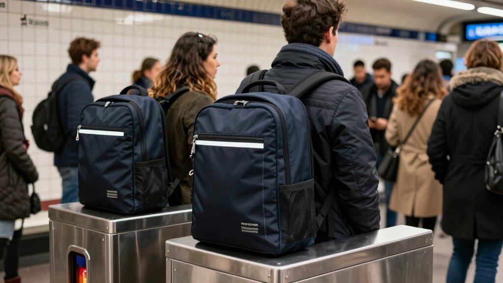 Since comfort and security go hand in hand, selecting a backpack that fits well is essential for maneuvering the busy Paris Metro. I recommend choosing a pack with adjustable straps so you can customize the fit to your body shape and size. A compact size that fits snugly against your back not only reduces the risk of theft but also makes moving through crowded cars easier. Padded straps and back panels help distribute weight evenly, preventing discomfort during long rides or walks. Make sure the backpack’s dimensions suit your frame to avoid strain, especially when navigating tight spaces or standing for extended periods. An ergonomic design that stays close to your body without chafing or restricting movement is key for both comfort and security.