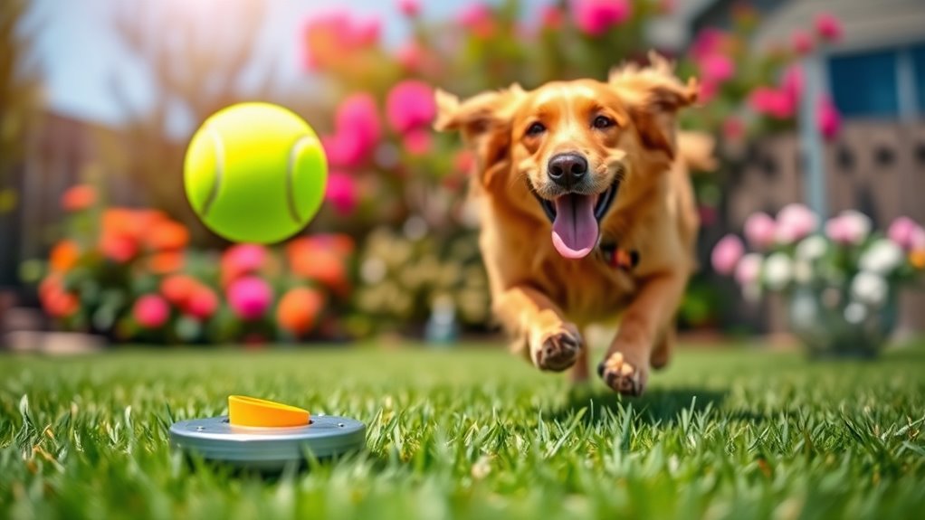 Safety features play an essential role in guaranteeing that your dog can enjoy playtime without unnecessary risks. Obstacle detection sensors are vital, as they stop or adjust the launcher if pets or people come too close, preventing injuries. Motion sensors that pause operation when pets enter the play area further reduce the risk of accidental collisions or harm. Many launchers include audible signals or warnings before launching, giving your dog a chance to anticipate the throw and avoid startle responses. Using soft, lightweight, and non-toxic balls minimizes choking hazards and dental damage. Finally, a stable base and well-designed settings guarantee the launcher operates safely within your designated play space, giving you peace of mind while keeping your pup active and happy.