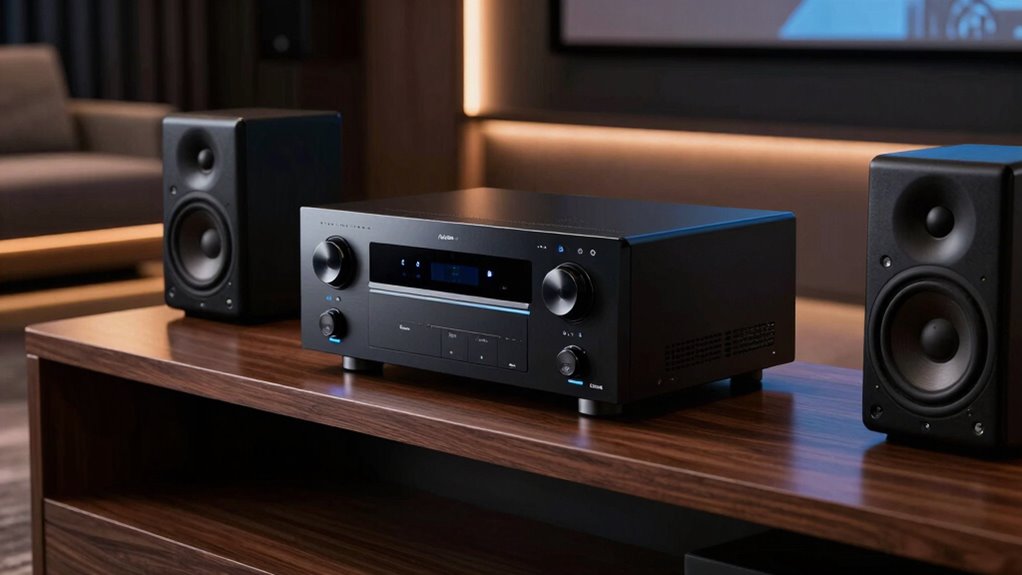 Are you ensuring your AV receiver can handle the latest and most immersive audio formats? Supporting formats like Dolby Atmos, DTS:X, and Auro-3D is essential for creating a truly three-dimensional soundscape. These formats allow sound to move around and above you, delivering a cinematic experience at home. Compatibility with PCM, Dolby Digital, and DTS-HD Master Audio guarantees high-quality multi-channel playback, critical for rich sound. With an 11.2-channel setup, precise rendering of complex surround configurations becomes possible, enhancing immersion. High-resolution audio formats like Dolby TrueHD and DTS-HD add clarity and fidelity to your media. Advanced receivers may also support object-based audio and upmixing technologies, expanding compatibility and guaranteeing you get the most out of diverse content.