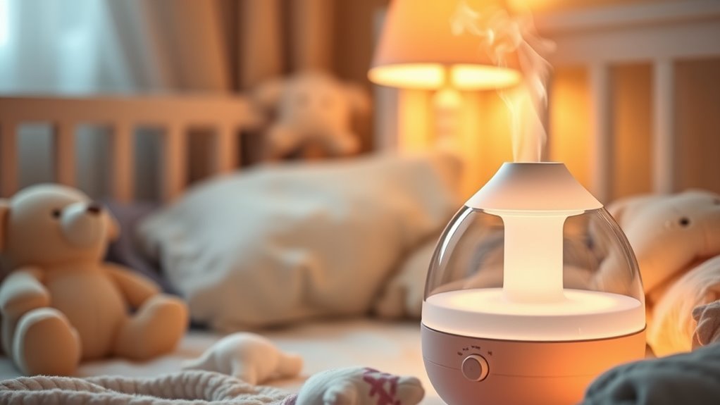 A quiet humidifier is essential for guaranteeing your baby can sleep peacefully without disruptions. Look for models that operate at 26dB or lower, which helps minimize noise during sleep. Ultrasonic humidifiers are typically quieter than evaporative types, making them a better choice for nighttime use. Many units feature sleep mode settings that turn off indicator lights and reduce noise further, creating a calmer environment. Auto shut-off functions are also valuable—they maintain consistent humidity without the need for constant adjustments, helping your baby sleep uninterrupted. When choosing a humidifier, test for low decibel levels to guarantee it won’t disturb your little one’s rest. Prioritizing quiet operation and sleep mode features can greatly improve your baby’s sleep quality and overall comfort.