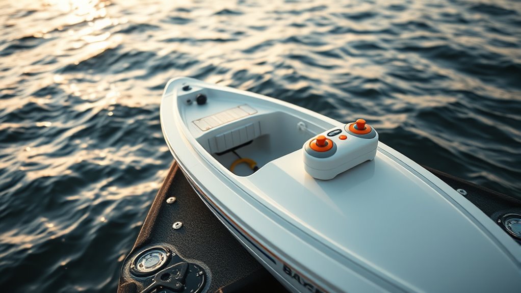 Imagine your bait boat gliding smoothly across the water’s surface—safety features guarantee that moment stays worry-free. Look for automatic shut-off to prevent battery mishaps, sealed electronics to keep water out, and sturdy, non-slip handles for secure control. A reliable GPS feature helps avoid getting lost, and reflective decals boost visibility. These safety features help you focus on fishing, knowing your boat’s built to keep you safe every step of the way.