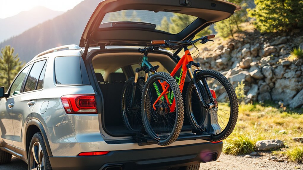 Choosing the right bike rack for your SUV starts with ensuring it’s compatible with your vehicle’s specific features. First, check that the rack fits your hitch receiver size, which is usually 2 inches for SUVs. If you’re opting for a trunk-mounted model, make sure it allows easy access to your rear door or trunk without interfering with the bikes. It’s also essential to verify that the rack’s weight capacity matches your bikes, especially if you have heavier bikes like e-bikes or fat tires. Additionally, confirm that the rack’s dimensions and mounting system align with your SUV’s attachment points and overall size. Always review the manufacturer’s specifications for vehicle compatibility to prevent issues related to clearance, stability, and safety during transport.