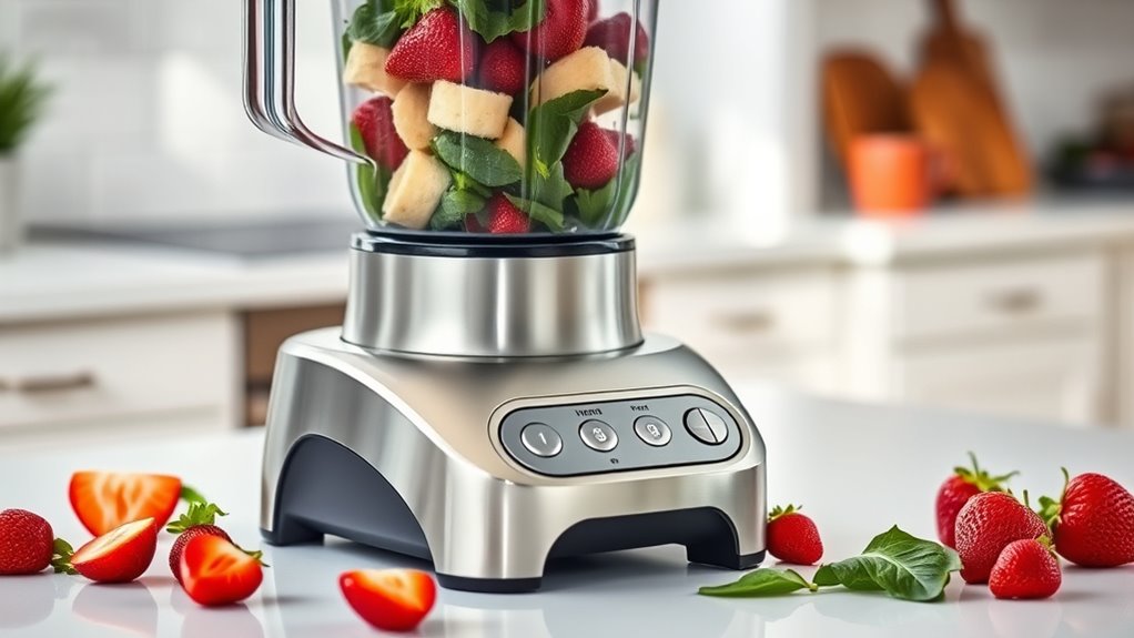 Adding extra features and accessories to a blender can considerably boost its versatility and ease of use. Preset programs, pulse functions, and variable speed controls let me customize blends for perfect smoothies every time, making the process quick and simple. Accessories like travel cups and spill-proof lids improve portability, while cleaning brushes help keep the blender hygienic with minimal effort. Some blenders include recipe guides or pre-set functions, which simplify operation and ensure consistent results. BPA-free and dishwasher-safe parts are essential for safety and easy maintenance. Additionally, extra attachments like food processing blades or additional cups expand the blender’s capabilities beyond smoothies, allowing me to prepare a variety of recipes with one device. These features and accessories enhance convenience and functionality, making blending more enjoyable.