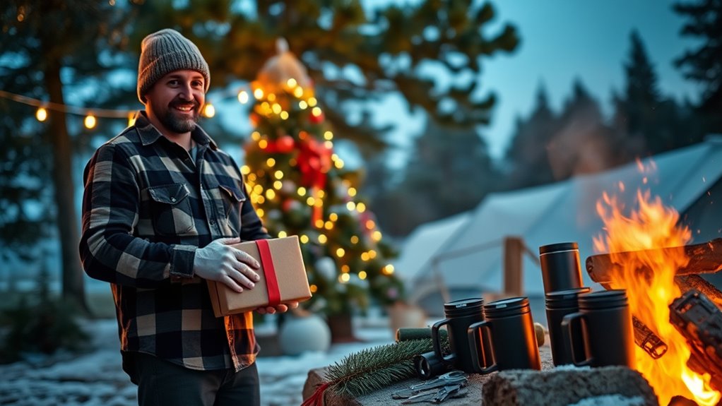 Ever wondered how to pick camping gifts that won’t weigh down your pack or get lost in the shuffle? The key is choosing compact, lightweight items that are easy to carry and pack. Look for gifts that fit comfortably in standard holiday stockings or small gift bags—think mini lanterns or multi-tools. These items are perfect for outdoor use and won’t clutter your gear. Check that the gift dimensions suit men’s backpacks or camping compartments, ensuring hassle-free storage. Smaller, travel-friendly gifts are also ideal for white elephant exchanges and Christmas stockings. Prioritizing size and portability helps you find practical, thoughtful gifts that won’t add unnecessary weight or bulk, making your camping adventures more enjoyable and stress-free.