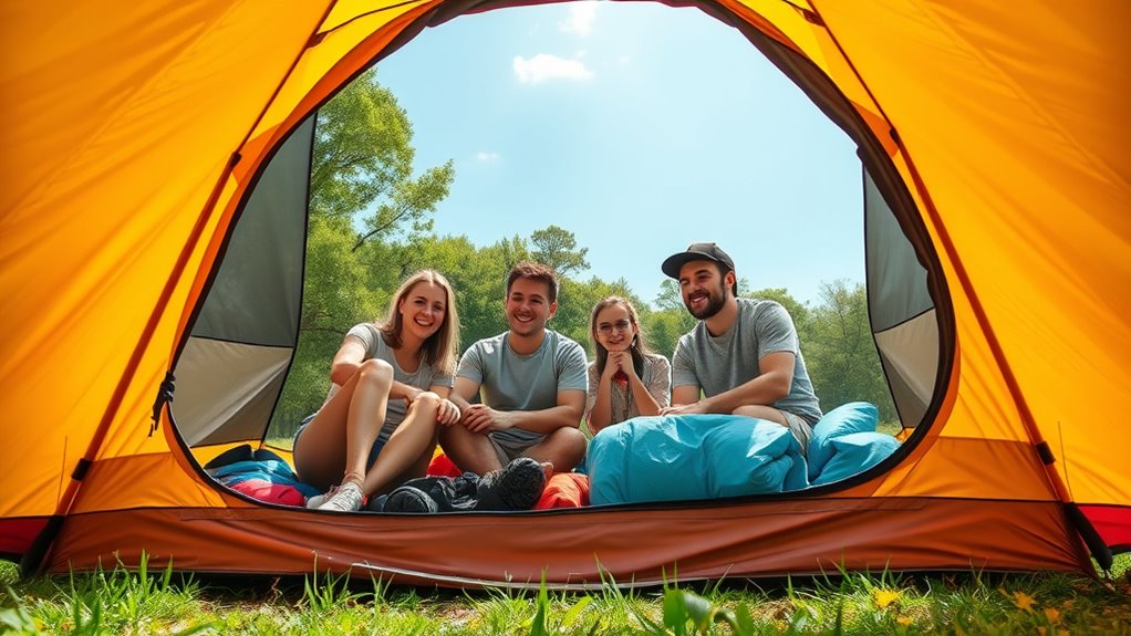 When choosing a 4-person tent, I look for safety features like sturdy, reinforced poles for stability, and secure, weather-resistant zippers to keep out the elements. I also check for fire-retardant fabrics and proper ventilation to prevent condensation and guarantee airflow. Reflective guy lines or stakes are helpful for visibility at night, and having a reliable rainfly adds extra protection against unexpected weather.