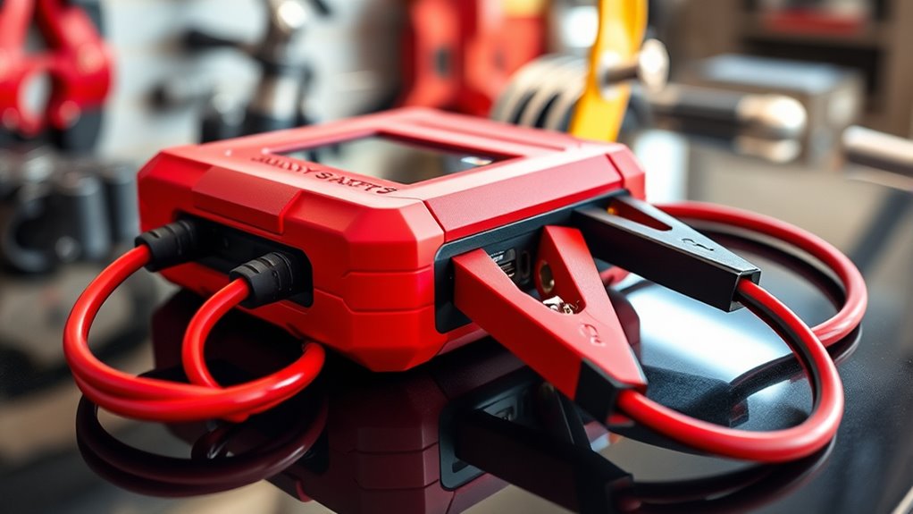 Safety features are essential to guarantee that jump-starting your vehicle is both effective and secure. Reverse polarity protection is a must, as it prevents accidental damage to your vehicle and reduces the risk of electric shocks. Spark-proof clamps ensure a safe connection by stopping sparks that could ignite flammable gases around the battery. Overcurrent and overvoltage protections guard against electrical overloads, protecting both the jump starter and your vehicle’s system. Safety alarms or indicator lights alert you to incorrect connections, minimizing user error. Built-in safety protocols and automatic shut-off functions help prevent overheating, short circuits, and unintended activation. Prioritizing these safety features gives me peace of mind, knowing I’m protected during emergency jump-starts and avoiding potential hazards.