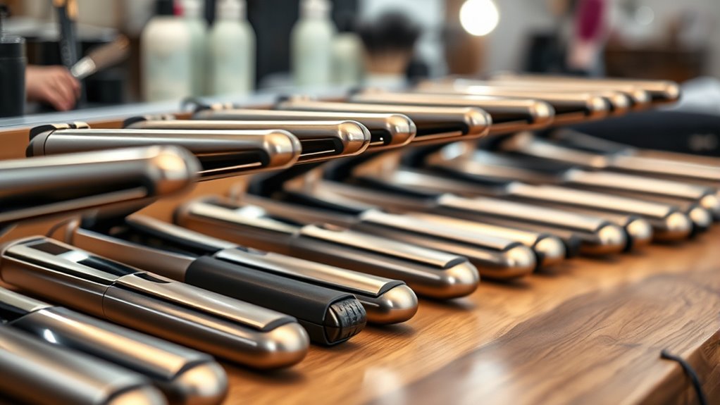 Fast heat-up times are essential for efficient styling, allowing you to get started in as little as 10 to 30 seconds. This quick readiness helps you save time and reduces frustration, especially during busy mornings. Look for flat irons with precise temperature control—adjustable up to 450°F—to tailor heat levels to your hair type, minimizing damage. Digital displays or indicator lights are helpful for monitoring when the iron reaches your desired temperature, preventing overheating. Consistent temperature maintenance during styling ensures even results across all sections, making your look sleek and polished. Safety features like auto shut-off and lock-in temperature settings add peace of mind, preventing accidents and accidental adjustments. Overall, a flat iron with fast, controllable heat-up capabilities makes styling faster, safer, and more effective.