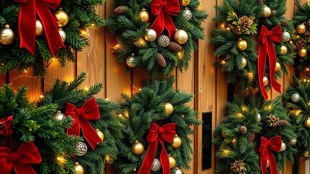 Decorative elements play a crucial role in creating an eye-catching and festive front door wreath. I recommend incorporating a variety of accents like pinecones, berries, ribbons, and ornaments to add texture and visual interest. When selecting these elements, think about your holiday theme and color scheme to make sure everything looks cohesive and vibrant. Using natural-looking materials such as faux pine needles and berries can give your wreath an elegant, realistic touch. To make your wreath stand out even more, consider adding lighting, like LED lights or luminous accents, which are especially striking at night. It is vital to securely attach all decorative pieces so they withstand outdoor weather conditions and stay beautiful throughout the season. Thoughtful choices here make all the difference in creating a warm, inviting first impression.