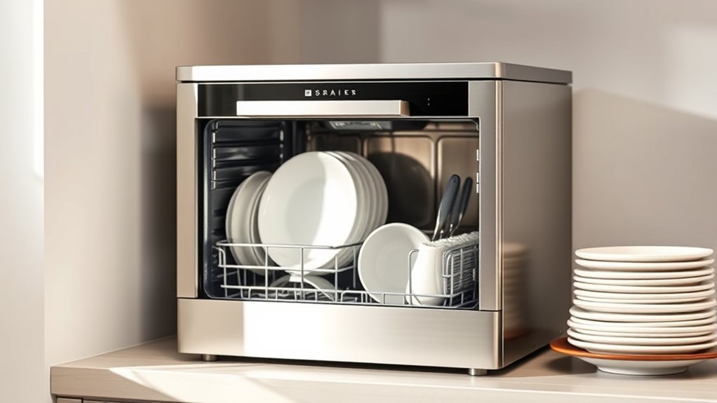 Choosing the right compact counter dishwasher starts with considering its size and capacity to make sure it fits your space and meets your needs. First, measure your available kitchen area, including clearance for opening doors and loading dishes, to ensure a proper fit. Next, look at the dishwasher’s capacity, usually between 4 and 6 place settings, to match your household’s daily dishwashing needs. Pay attention to interior features like adjustable racks and foldable shelves, which help accommodate larger or oddly shaped items. Check the overall size—height, width, and depth—to prevent obstructing other appliances or cabinetry. Finally, evaluate if the capacity aligns with your typical usage, so you avoid overloading or underutilizing the dishwasher. Proper sizing ensures convenience and efficiency.