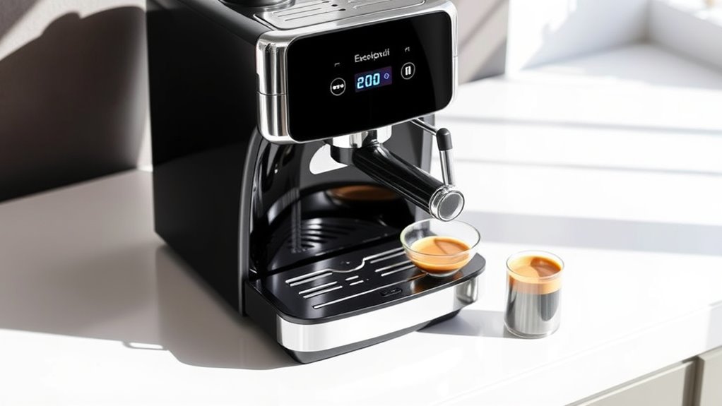 Selecting a compact espresso machine involves more than just functionality; its design and aesthetics can considerably enhance your kitchen’s look. I recommend considering the machine’s size and dimensions to make sure it fits comfortably on your countertop without cluttering space. Pay attention to design elements like the exterior finish, shape, and color—these should complement your kitchen decor and reflect your personal style. A sleek, minimalistic profile often works best, offering a modern look without sacrificing usability. Materials like stainless steel or durable ABS plastic not only add visual appeal but also boost durability. Additionally, features such as removable drip trays and accessible components make cleaning easier, helping your machine stay attractive and functional over time.