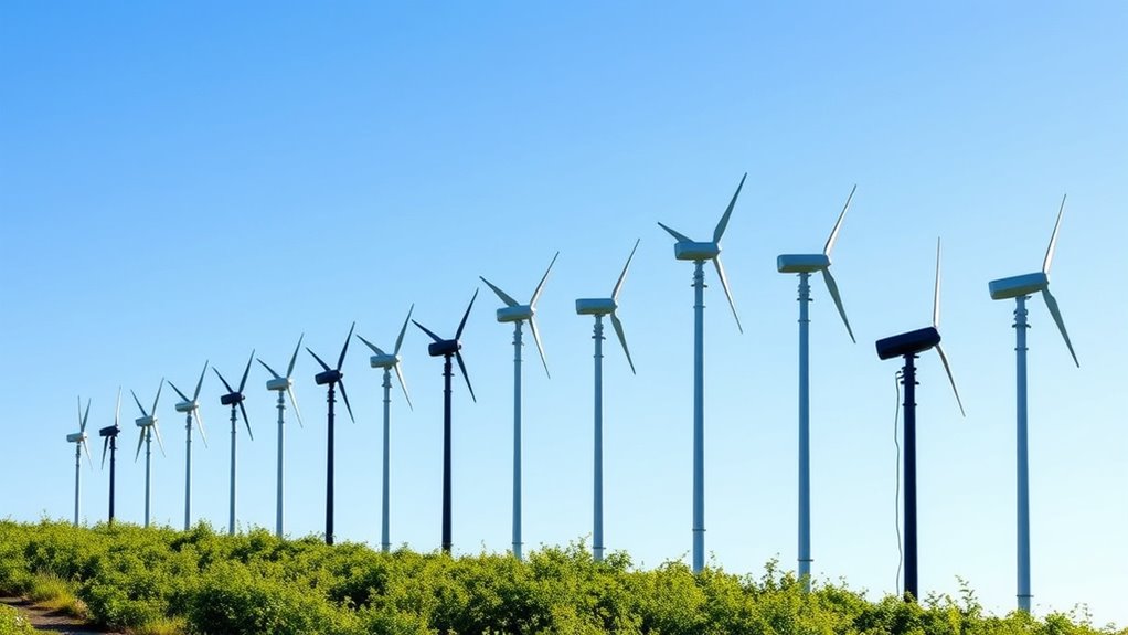 Noise levels are a crucial factor to contemplate because they can profoundly impact your comfort and neighborhood peace. Compact wind turbines typically generate sound between 55dB and 62dB, which can be noticeable depending on your environment. If you live in a quiet residential area, turbines operating at the lower end of this range—around the sound level of a normal conversation—are usually preferable. Models with dual bearings and optimized blade design tend to produce less noise, making them more suitable for sensitive locations. For those especially concerned about noise, turbines with sound-dampening features or enclosures can help keep sound levels within acceptable limits. Monitoring noise in decibels ensures your turbine operates within your tolerance and complies with local regulations, balancing efficiency with peace of mind.