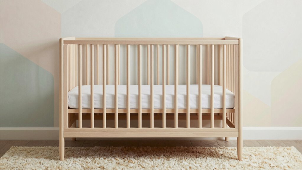 Modern cribs usually don’t require any special bedding or accessories beyond standard crib sheets, which are readily available and easy to find. I recommend choosing fitted sheets made specifically for crib mattresses to guarantee safety and comfort. Avoid bulky bedding, pillows, or stuffed animals, as they can pose risks. Simply pair the crib with a few cozy, stylish sheets, and you’re all set for a safe, modern nursery look.