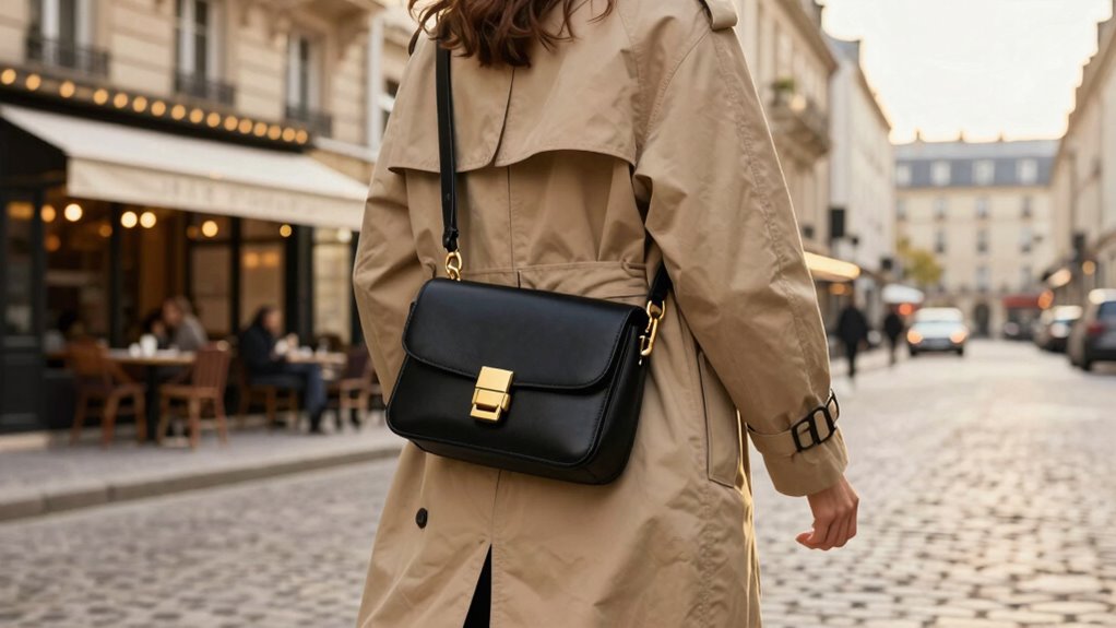 When choosing a crossbody bag for your Paris adventure, it’s important to contemplate how its style and design reflect your personal taste and enhance your overall look. Whether you prefer a classic, trendy, or Parisian-themed style, select a bag that complements your wardrobe and personality. Look for aesthetic details like Eiffel Tower motifs, city skylines, or floral patterns that match your outfit and evoke the Parisian vibe. A versatile color palette—either neutral shades for subtle elegance or bold hues for a statement—can elevate your look. Unique patterns and vivid designs add a fashionable touch and help you stand out. Just guarantee the bag’s design includes functional features like adjustable straps and multiple compartments for practicality without sacrificing style.