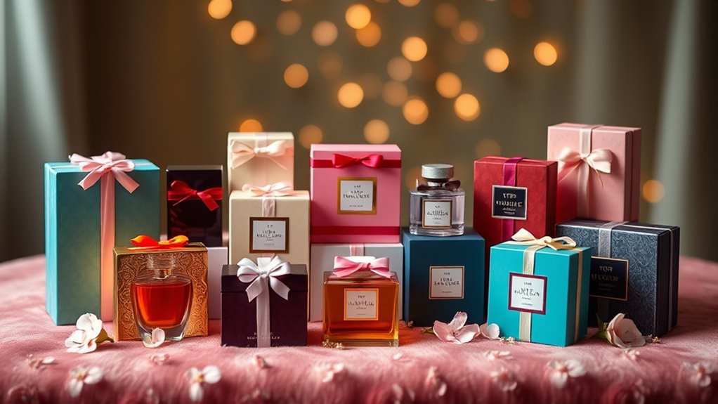 When choosing a fragrance, think of it like picking a bouquet; each scent can evoke different emotions. I always consider the recipient’s allergies first. Some fragrances can trigger reactions, so I check for hypoallergenic options or those labeled as fragrance-free. It’s wise to know their favorite scents or if they prefer lighter, fresher notes. A thoughtful approach guarantees my gift doesn’t just smell good but also keeps them comfortable and happy.