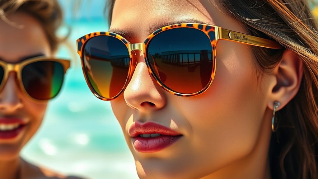 Since summer style is all about versatility, I look for sunglasses with frame shapes like square, oval, or cat eye that seamlessly suit various face types and outfit choices. Classic colors such as black, tortoise, or metallic finishes make it easy to match different looks, whether casual or dressy. I also prioritize frame materials like acetate or metal, which offer durability and a stylish vibe. Adjustable features or flexible hinges ensure a comfortable fit across different face sizes and shapes. To maximize sun protection while maintaining style flexibility, I choose designs with polarized or UV400 lenses. These elements help me find sunglasses that are not only fashionable but also practical for summer adventures, making them perfect for any occasion.