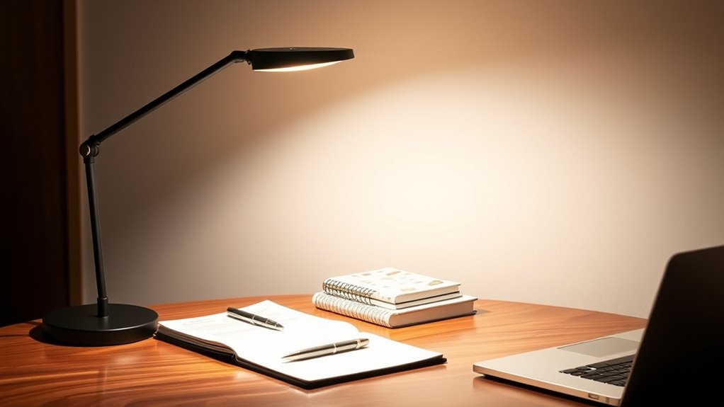 You might think all light is equal, but different color temperatures really do impact your work. Cooler temps, like daylight, boost alertness and focus—great for tasks requiring precision. Warmer hues create a cozy vibe, perfect for winding down. So, switching modes can either energize or relax you, making your workspace adaptable. Honestly, it’s like having a mood ring for your desk—who knew lighting could be so clever?