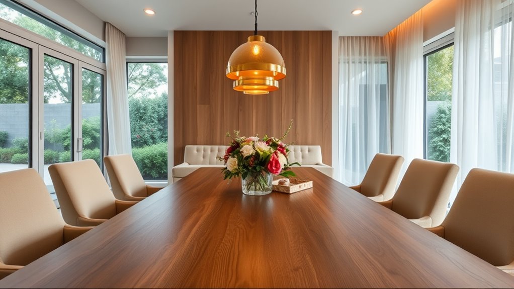 I recommend choosing dining table sets made from solid hardwoods like oak or maple for daily durability. I’ve found that tables with sturdy metal frames or reinforced edges also stand up well to frequent use. I personally prefer sets with scratch-resistant finishes and easy-to-clean surfaces, as these features help maintain the table’s look over time. Investing in quality materials guarantees your table lasts and stays beautiful year after year.