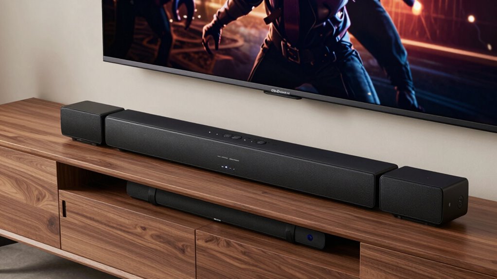 The size of your room plays a crucial role in selecting the right Dolby Atmos soundbar, as it directly impacts how well the system can fill the space with immersive sound. Larger rooms over 200 square feet typically need higher wattage soundbars with multiple speakers, including upward-firing and rear surround channels, to guarantee even sound distribution. For smaller rooms, compact soundbars with upward-firing speakers often suffice, creating a convincing surround effect without overwhelming the space. Room acoustics, such as open layouts or furniture placement, also influence the choice, affecting sound dispersion. Proper calibration and room tuning features become essential in larger spaces to optimize sound quality and surround effects, ensuring you get the most immersive experience regardless of your room’s size.