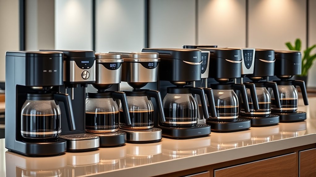 Looking for the best drip coffee makers for your office in 2025? I recommend models with features like quick brewing, programmable timers, and large capacities—perfect for busy environments. Brands like Cuisinart, Ninja, Taylor Swoden, and VEVOR offer options with programmable settings, easy maintenance, and safety features. Whether you need a 10, 12, or 14-cup model, there’s something to fit your space and demand. Keep exploring to find the ideal brew for your office.