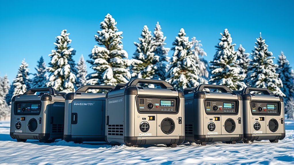 Choosing a dual fuel inverter generator for cold weather demands careful attention to features that guarantee reliable performance in low temperatures. I look for models with upgraded low-temperature lithium batteries, ensuring the generator starts reliably even in freezing conditions. Cold start technology or automatic idle control is essential, as it helps the engine run smoothly without stalling. I also verify that the engine is rated to operate in temperatures as low as -4°F (-20°C), preventing issues during winter use. Fuel line heaters or insulated components are critical to avoid fuel gelling or freezing. Additionally, clear digital displays and safety features like CO sensors that function accurately in cold conditions give me peace of mind. These factors collectively ensure dependable operation in harsh winter environments.