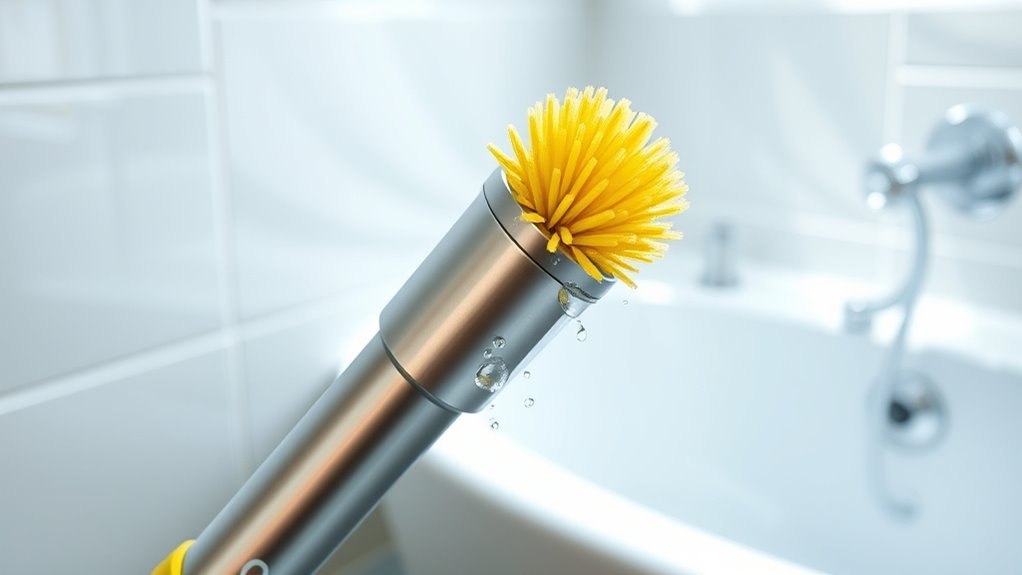 When selecting an electric spin scrubber, I pay close attention to its waterproof and safety features to guarantee reliable performance in wet environments. I look for models with an IPX7 or higher waterproof rating, ensuring they can handle immersion without damage. It’s essential that the device is built with waterproof materials like sealed motors and water-resistant components to prevent water from seeping in. Safety features such as automatic shutoff and water-resistant switches are critical, as they reduce electrical risks during use in damp areas. I also verify that the handle and battery compartment are designed to withstand exposure to water, minimizing corrosion and short circuits. Choosing a product with certified waterproof standards gives me confidence that it’s safe and dependable for bathroom, kitchen, or outdoor use.