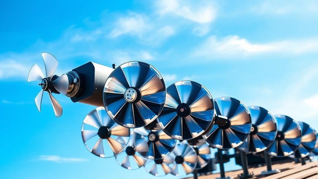 Choosing a solar-powered emergency ventilation fan with high energy efficiency is essential for maximizing airflow while minimizing power consumption. Fans with photovoltaic conversion rates above 20% deliver better efficiency, especially in low-light conditions, guaranteeing consistent performance. Advanced motor technologies, like brushless or turbo-style designs, help boost airflow while reducing energy use. Proper placement and tilt of solar panels are critical; optimizing sunlight absorption directly enhances overall efficiency. Additionally, energy-efficient models often feature low standby power and intelligent control modes that adapt to environmental conditions, conserving energy when airflow demand is lower. Prioritizing these factors means your system will operate more effectively and cost-efficiently, providing reliable ventilation even in challenging conditions. This focus on energy efficiency ultimately ensures safer, more sustainable airflow management.