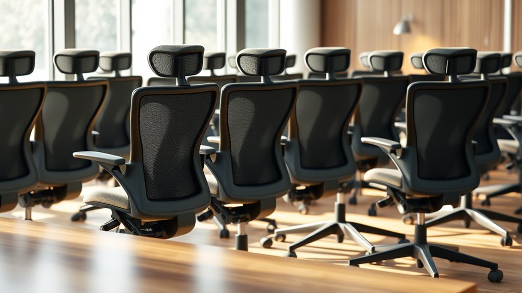 Have you ever wondered how to guarantee your office chair supports your body perfectly during long hours? Adjustable support features are key. An adjustable lumbar support helps keep your spine aligned, reducing lower back strain. Multi-directional headrests can be tailored in height, tilt, and depth, offering personalized neck and head support. Reclinable backrests with adjustable tilt tension let you set the perfect angle for comfort and encourage movement. Proper armrest adjustments—height, width, and swivel—ensure your arms are supported correctly, easing shoulder tension. Seat height and depth adjustments accommodate different body sizes, promoting good posture and reducing pressure points. These customizable features work together to keep you comfortable, focused, and free from discomfort during extended sitting sessions.