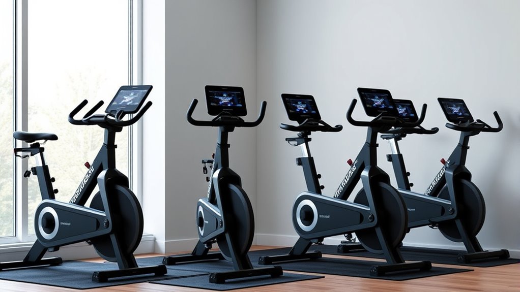I find that bikes with advanced digital displays and integrated sensors offer the most accurate workout tracking. Look for models with heart rate monitors, cadence sensors, and connectivity to fitness apps. I prefer bikes that sync seamlessly with my devices, providing real-time data on calories, distance, and effort. When choosing, I focus on bikes with proven tracking accuracy to guarantee my workouts are effective and my progress is reliable.