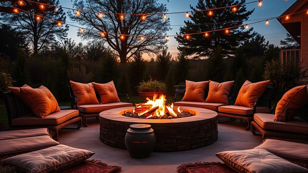 Think of a fire pit as a cozy campfire in your small backyard. I recommend compact models like portable fire bowls or tabletop designs—they fit snugly without overwhelming your space. Look for ones with adjustable flames and safety features. These little sparks of warmth and ambiance turn even tiny yards into inviting retreats, making every evening feel like a special gathering around a crackling fire.