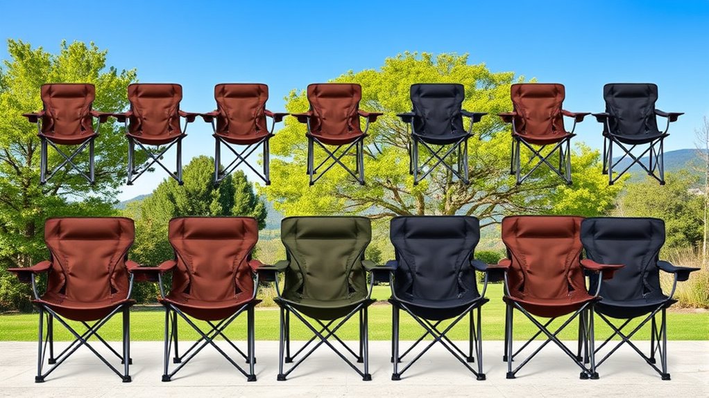 I recommend looking for chairs made from high-quality steel or aluminum frames, as they provide strength without adding excessive weight. The fabric should be durable, like heavy-duty polyester or nylon with a waterproof coating, to resist tearing and weather damage. Reinforced stitching and rust-resistant hardware also boost longevity. These materials guarantee your chair remains sturdy and comfortable, even after frequent use and exposure to the elements.