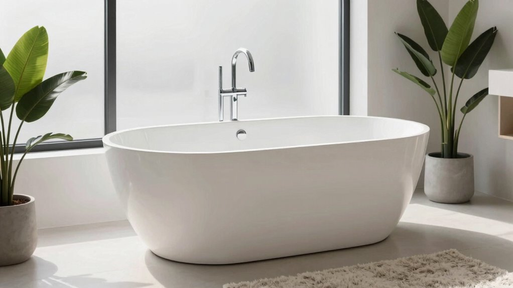 The best materials for durability in freestanding bathtubs are cast iron, acrylic, and stone resin. I’ve found cast iron to be incredibly sturdy and long-lasting, though heavy and less heat-retentive. Acrylic tubs are lighter, resistant to chipping, and retain heat well. Stone resin offers a great balance of durability and aesthetic appeal, resisting scratches and stains. These materials guarantee your bathtub stays beautiful and functional for years to come.